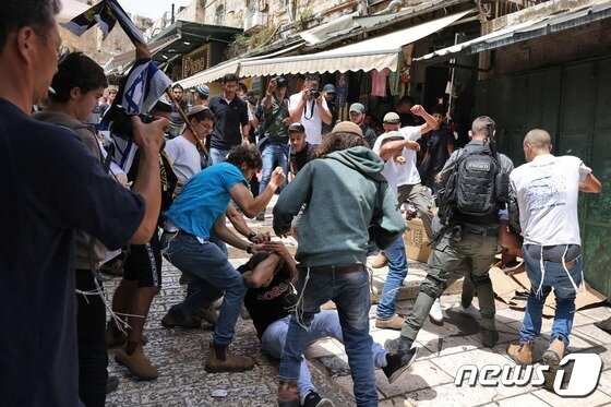 동예루살렘 점령을 기념하는 이스라엘 ‘깃발 행진’이 예루살렘에서 18일(현지시간) 열린 가운데, 참여자들이 팔레스타인 주민들을 폭행하고 있다. © AFP=뉴스1 © News1 박재하 기자