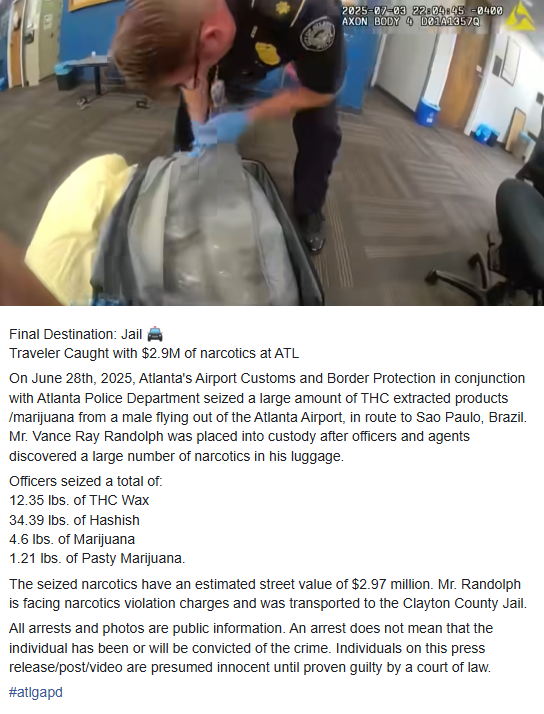 애틀랜타 경찰은 7월 12일 공식 페이스북을 통해, 22세의 밴스 레이 랜돌프(Vance Ray Randolph)가 지난 6월 28일 출국 시도 중 세관국경보호국(CBP)과 합동 단속으로 체포됐다고 밝혔다.