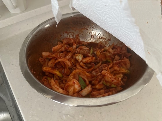 이날 아버지는 평소처럼 고기를 양념에 재워두고 잠시 쓰레기 버리러 밖으로 나갔다고. 사진 속 고기는 양파와 애호박 등 야채들과 함께 빨간 양념으로 버무려진 상태였다.