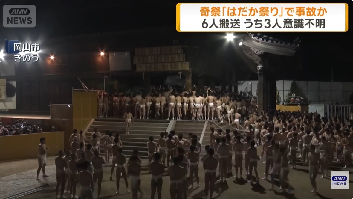 22일 교도통신, 아사히신문 등에 따르면 21일 오후 10시 15분쯤 오카야마시 히가시구의 사이다이지 관음원에서 열린 ‘사이다이지 회양’ 행사 도중 참가자 6명이 다쳐 병원으로 이송됐다. 그중 40~50대 남성 3명은 의식 불명 상태인 것으로 확인됐다.