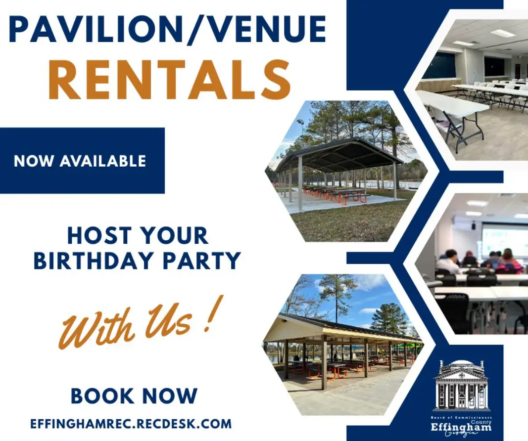 대관 신청은 effinghamrec.recdesk.com에서 가능하며, 자세한 문의는 젠 볼드윈(Jbaldwin@effinghamcounty.org
