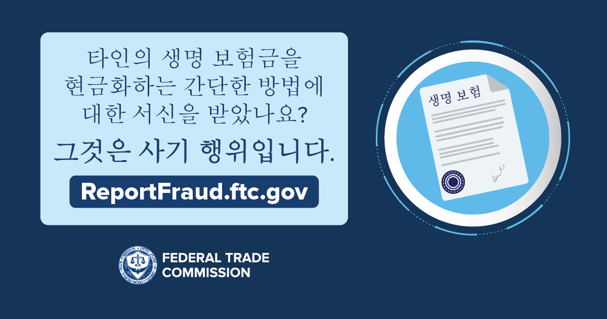 FTC 는 최근 한국, 베트남, 라틴 커뮤니티에서 캐나다에 거주 중인 “변호사”가 보낸 서신을 받았다는 사람들의 신고를 접수하였습니다. 로펌에서 발송한 듯한 이 서신은 타인의 생명 보험금을 현금화 할 수 있는 “간편한 방법”을 설명합니다. 하지만 그것은 사기 행위입니다. 다음을 통해 사기 행위를 알아차릴 수 있습니다.