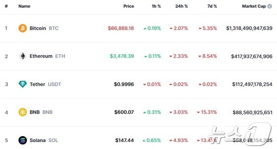 14일 오전 7시 30분 현재 글로벌 코인 시황 중계 사이트인 코인마켓캡에서 비트코인은 24시간 전보다 2.07% 하락한 6만6888달러를 기록하고 있다.