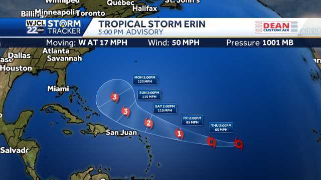 WJCL-국립허리케인센터(NHC)에 따르면 열대폭풍 ‘에린(Erin)’은 북쪽 리워드제도에서 약 1,300마일(약 2,092km) 동쪽 해상에서 시속 17마일(약 27km) 속도로 서진하고 있다. 현재 해상 환경이 발달에 유리해 향후 며칠 내 세력이 강화될 것으로 보이며, 금요일(15일)까지 올 시즌 첫 허리케인으로 격상될 전망이다. 주말 말미에는 ‘메이저 허리케인’(사파-심프슨 기준 3등급 이상)으로 발달할 가능성도 크다.