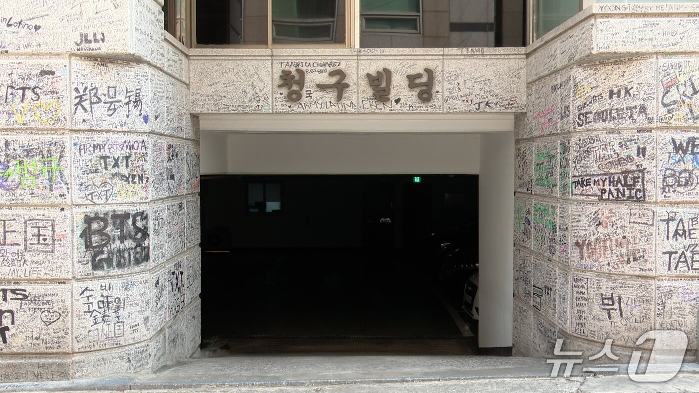 BTS의 소속사 하이브의 옛 사옥인 청구빌딩은 팬들의 흔적들로 가득 차 있다. 건물 외벽은 국내외의 방탄소년단 팬들이 사인펜으로 정성껏 눌러 쓴 이름과 문구들로 빈틈없이 뒤덮여, 다채로운 벽화처럼 장관을 이룬다.