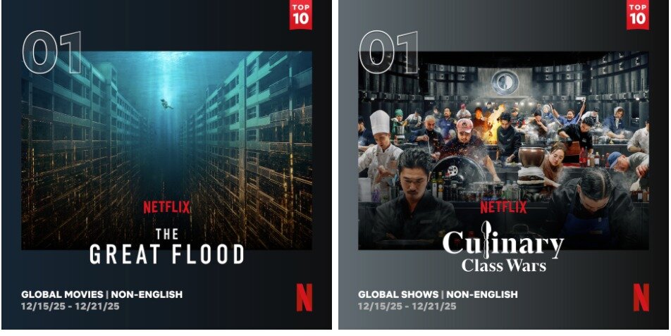 한국 영화 ‘대홍수’와 한국 예능 프로그램 ‘흑백요리사2’가 넷플릭스 글로벌 차트 1위에 올랐다.