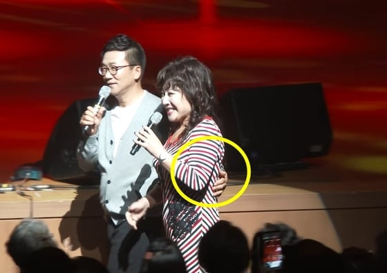 이어 유영재는 다시 노사연과 손을 잡고 함께 계단 아래로 내려가 가까이서 관객들을 만났다. 또 노사연이 손을 놓고 관객들의 손을 잡자, 유영재는 이번에 노사연의 등에 손을 올렸다.