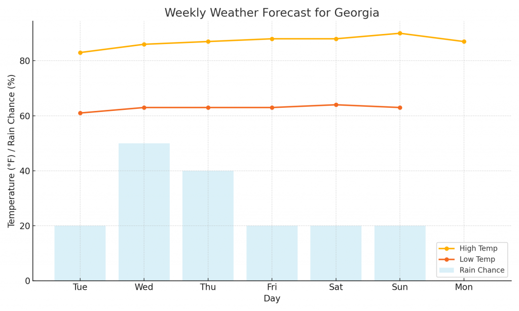 이번 주 조지아는 무더위와 잦은 뇌우가 반복될 전망이므로, 외출 시 우산과 가벼운 우비를 준비하는 것이 좋겠다. 기상청은 천둥번개 동반 시 외부 활동을 자제하고 실내에 머무를 것을 권고하고 있다.
