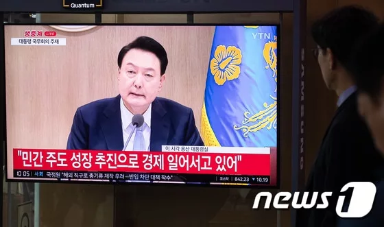 16일 서울역에서 시민들이 윤석열 대통령 주재 국무회의 생중계를 지켜보고 있다. 윤 대통령은 이날 용산 대통령실에서 열린 국무회의에서 "어려운 국민을 돕고 민생을 챙기는 것이 정부의 존재 이유"라며 "그런 측면에서 이번 총선을 통해 나타난 민심을 우리 모두 겸허하게 받아들여야 한다"고 밝혔다. 2024.4.16/뉴스1 © News1 유승관 기자