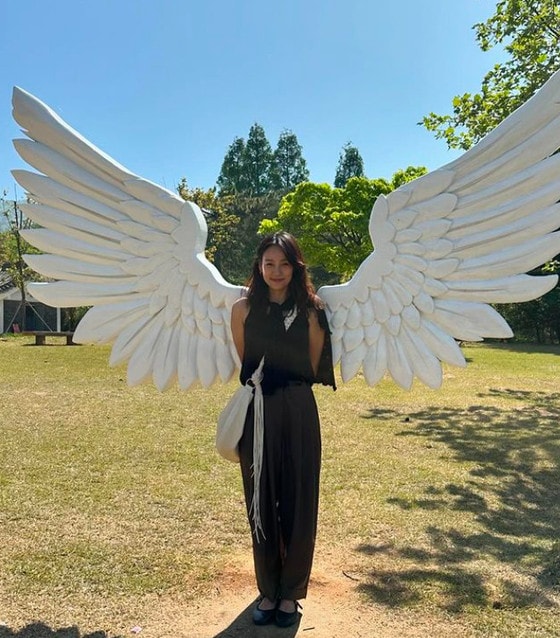 사진 속 이효리는 날개 조각상에서 포즈를 취한 모습. 상큼한 미소가 돋보이는 미모가 눈길을 끈다.