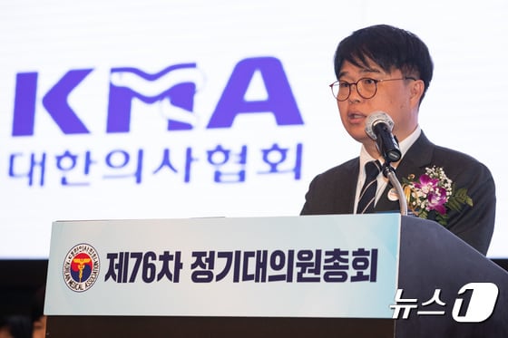 임현택 대한의사협회장 당선인이 28일 서울 서초구 더케이호텔에서 열린 대한의사협회 제76차 정기대의원총회에서 인사말을 하고 있다. 2024.4.28/뉴스1 © News1 유승관 기자