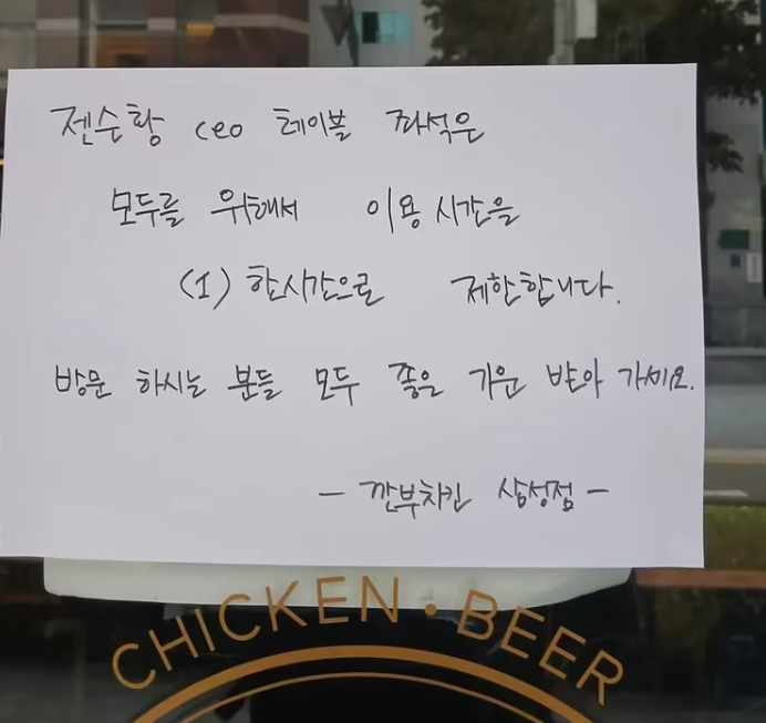4일 한 온라인 커뮤니티에는 ‘깐부치킨에 다녀간 젠슨 황이 앉아 있던 테이블 근황’이라는 제목의 게시물이 큰 화제를 모으고 있다.