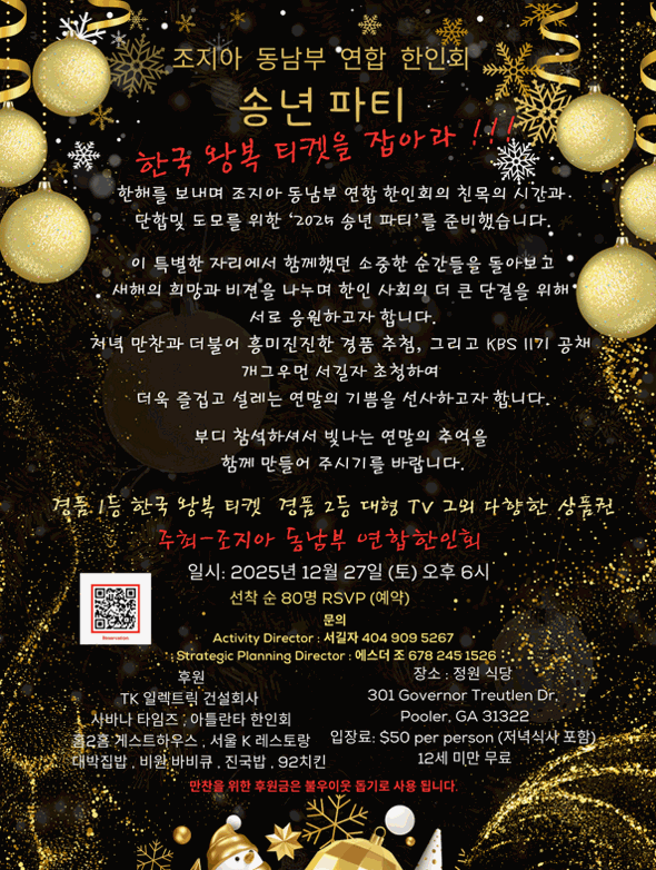 조지아 동남부 연합 한인회는 다사다난했던 2025년 한 해를 마무리하며, 지역 교민들을 위한 2025 교민 송년파티를 오는 12월 27일(토) 오후 6시, 풀러(Pooler)에 위치한 정식당에서 개최한다.