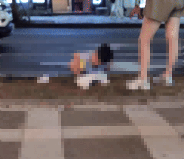 사진 속에는 도보 위 심어진 가로수 옆에 쪼그려 앉은 남자아이가 바지를 내리고 대변을 누고 있다. 그 옆에는 엄마로 보이는 여성과 일행이 가만히 서 있다.