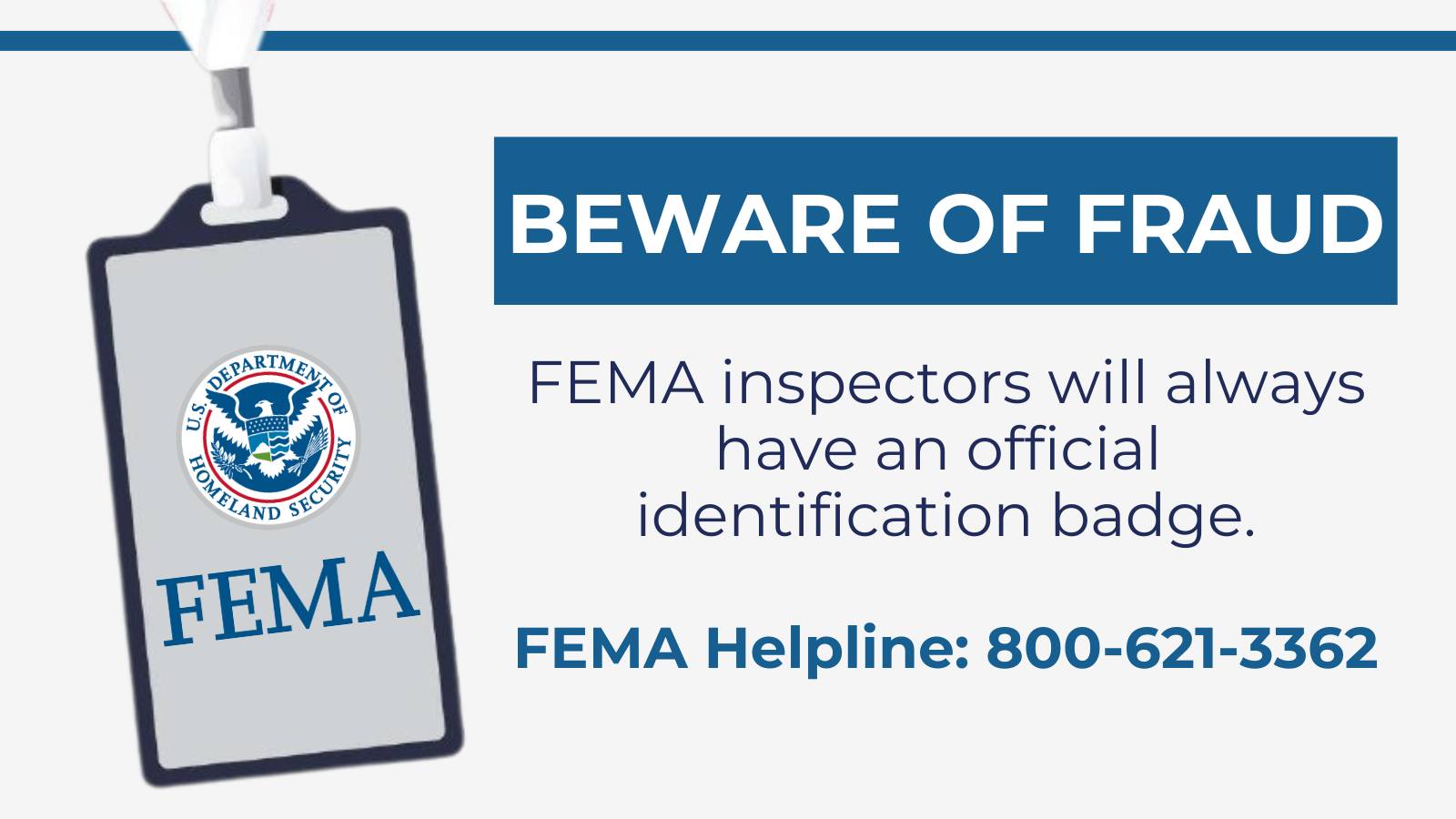당국은 알 수 없는 사람이 FEMA 요원이라고 주장하며 접근할 때는 신분증 제시를 요구하라고 당부했다.
