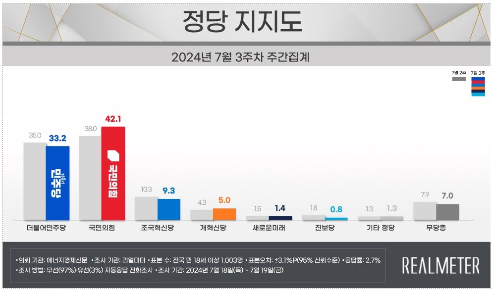 지난 18일부터 이틀간 전국 만 18세 이상 유권자 1003명을 대상으로 진행한 7월 3주 차 정당 지지도 여론조사에 따르면, 국민의힘 지지율이 이전 주(38.0%) 대비 4.1%포인트(p) 오른 42.1%를 기록했다.