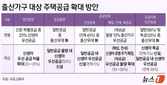 이를 위해 민간분양 신혼 특별공급 물량 내 신생아 우선공급 비율을 기존 20%에서 35%로 늘린다. 또 공공분양 일반공급 물량의 50%를 활용해 신생아 우선공급을 만든다.