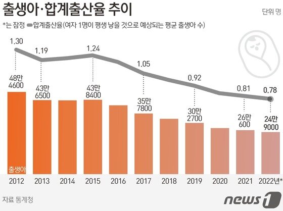 2017년부터 2022년(잠정)까지 1.05명→0.98명→0.92명→0.84명→0.81명→0.78명으로 급격하게 떨어지고 있다.