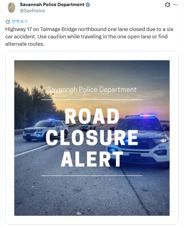 사바나 경찰국은 사회관계망(SNS)을 통해 “북행 차선 일부가 사고로 인해 통제 중이며, 운전자들은 가능한 우회 경로를 이용해 달라”고 안내했다.