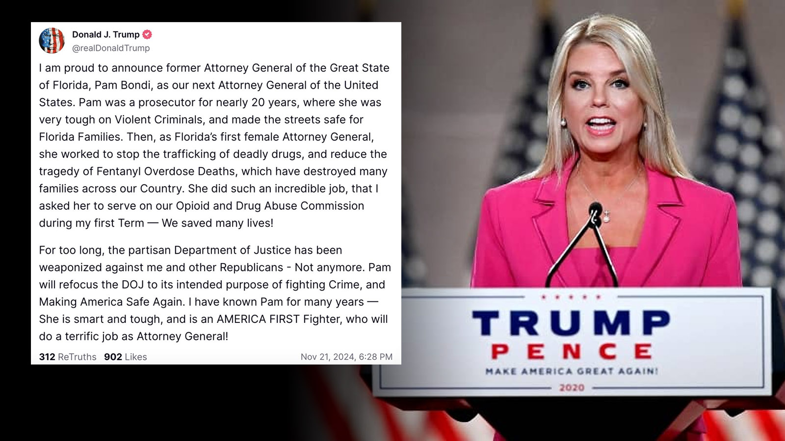 그러면서 “너무 오랫동안 당파적인 법무부는 저와 다른 공화당원들을 상대로 무기화됐다”며 “팸은 범죄와 싸우고 미국을 다시 안전하게 만드는 법무부 본래의 목적에 집중하도록 할 것”이라고 강조했다.