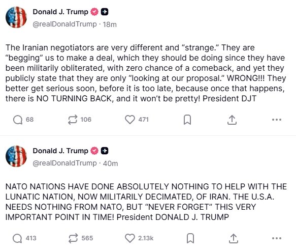 트럼프 대통령은 서방 군사 동맹인 북대서양조약기구(NATO·나토)가 이란 전쟁에서 아무것도 하지 않았다고 재차 비난했다. 그는 “나토 회원국들은 아무것도 하지 않았다. 미국은 나토에 아무것도 필요로하지 않지만, 이를 절대 잊지 않을 것”이라고 했다.