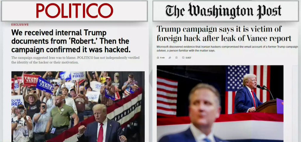 트럼프 캠프의 스티븐 청 대변인은 전날 성명을 통해 캠프 내부 이메일 일부가 해킹을 당했다면서 이를 이란의 소행으로 규정했다. 트럼프 전 대통령의 러닝메이트로 확정된 J.D 밴스 상원의원의 부통령 후보 자격 검증과 관련한 캠프 내부 문건이 최근 WP와 폴리티코 등 미 주요 언론사들에 익명 제보 형태로 전달되자 이를 이란이 벌인 일이라고 본 것이다.