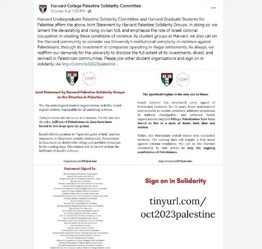 하버드 팔레스타인 연대 그룹(Harvard Palestine Solidarity Groups)은 지난 7일 이스라엘을 비판하는 성명을 발표했으며, 이에 국제 앰네스티 등 35개 단체가 서명했다.