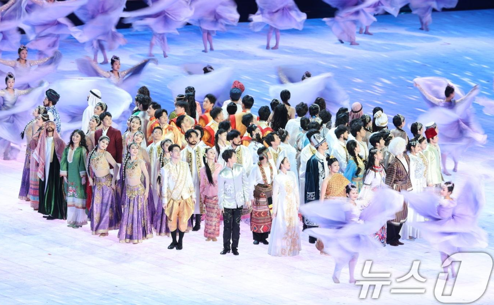 본문 이미지 - 7일(현지시간) 중국 헤이룽장성 하얼빈 국제 컨벤션 전시 스포츠센터에서 열린 제9회 하얼빈 동계아시안게임 개막식에서 축하공연이 펼쳐지고 있다. '2025.2.7/뉴스1 ⓒ News1 이승배 기자