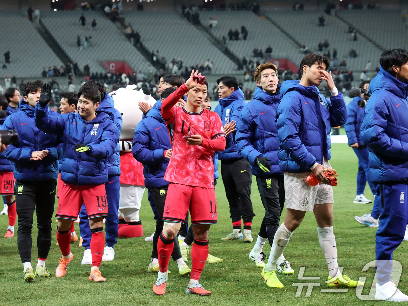 18일 오후 서울 마포구 서울월드컵경기장에서 열린 ‘하나은행 초청 국가대표팀 친선경기’ 대한민국과 가나와의 경기에서 1대0으로 승리한 대한민국 선수들이 팬들에게 인사하고 있다.