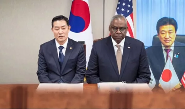 신원식 국방부 장관과 로이드 오스틴 미 국방장관, 기하라 미노루(木原稔) 일본 방위상은 12일 오후 대면 및 화상으로 진행한 3국 국방장관회의를 통해 이같이 의견을 모았다고 우리 국방부가 전했다. 신 장관과 오스틴 장관은 이날 서울 용산구 국방부 청사에서, 그리고 기하라 방위상은 화상으로 이날 회의에 참석했다.
