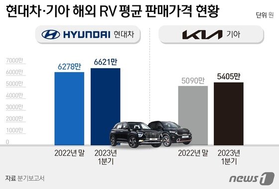 16일 금융감독원 전자공시시스템에 따르면 현대차의 1분기 해외 RV 평균 판매가격은 6621만원으로 집계됐다. 지난해 말 6278만원보다 343만원(5.4%) 올랐다. 해외 승용차 평균 판매가격 역시 같은 기간 5044만원에서 5389만원으로 345만원(6.8%) 상승했다.