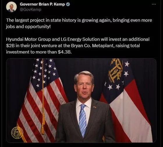 그러면서 “조지아주가 기업하기 좋은 주임을 다시 한 번 인정해준 현대차그룹과 LG엔솔에 감사드린다”고 했다.