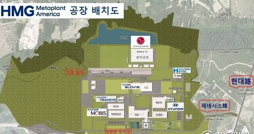 현대자동차그룹의 미국 전기차 전용 공장 ‘현대차그룹 메타플랜트 아메리카'(HMGMA) 세부 배치도가 공개됐다. 배터리 공장과 자동차 모듈, 고전압 배터리 시스템(BSA) 생산 시설 등 전기차 생산 역량이 집약된 모습이다. 테슬라 기가팩토리를 압도한다는 평가이다.