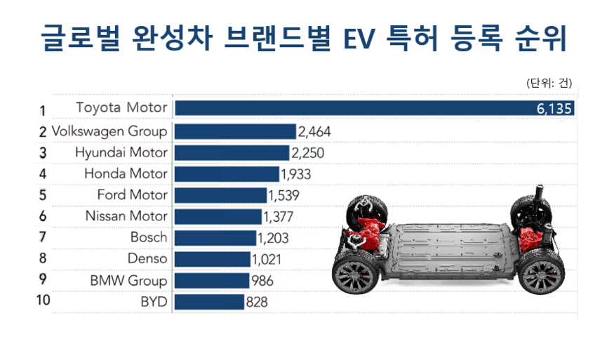 1일 일본 종합상사 미쓰이물산 산하 싱크탱크 ‘미쓰이글로벌전략연구소(MGSSI)’가 지난 2월 발표한 보고서에 따르면 현대차·기아는 전기차 관련 특허 총 2250건을 보유하며 도요타(6135건), 폭스바겐그룹(2464건)에 이어 글로벌 3위에 올랐다. △혼다(1933건) △포드(1539건) △보쉬(1203건) △덴소(1203건) △BMW그룹(986건) △비야디(BYD·828건) 등이 뒤를 이었다.