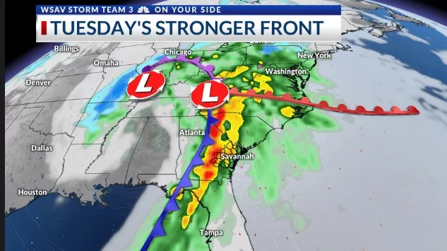 강력한 폭풍 시스템이 오늘과 내일 남동부를 통과하여 텍사스에서 노스캐롤라이나 해안까지 광범위한 악천후를 가져올 것으로 예상된다. 이곳 코스털 엠파이어와 로컨트리에 있는 서배너에도 화요일 오후부터 저녁까지 심한 폭풍이 발생할 위험이 있다고 기상청은 밝혔다.