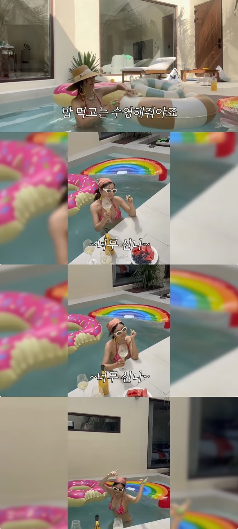 머리에는 두건, 눈에는 선글라스를 착용한 채 와인잔을 들고 물속에서 춤을 추며 휴가를 즐기는 여배우의 자유로운 모습이 눈길을 끈다. 특히 비키니 몸매는 60대라는 나이가 믿기지 않을 정도로 탄탄하다.