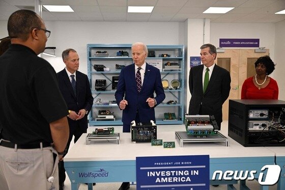 조 바이든 미국 대통령이 28일(현지 시각) 입법 성과를 홍보하기 위해 ‘인베스팅 인 아메리카’ 투어에 나서 노스캐롤라이나주 더럼에 있는 반도체 제조업체 울프스피드사를 방문하고 있다. 2023.3.28© AFP=뉴스1 |