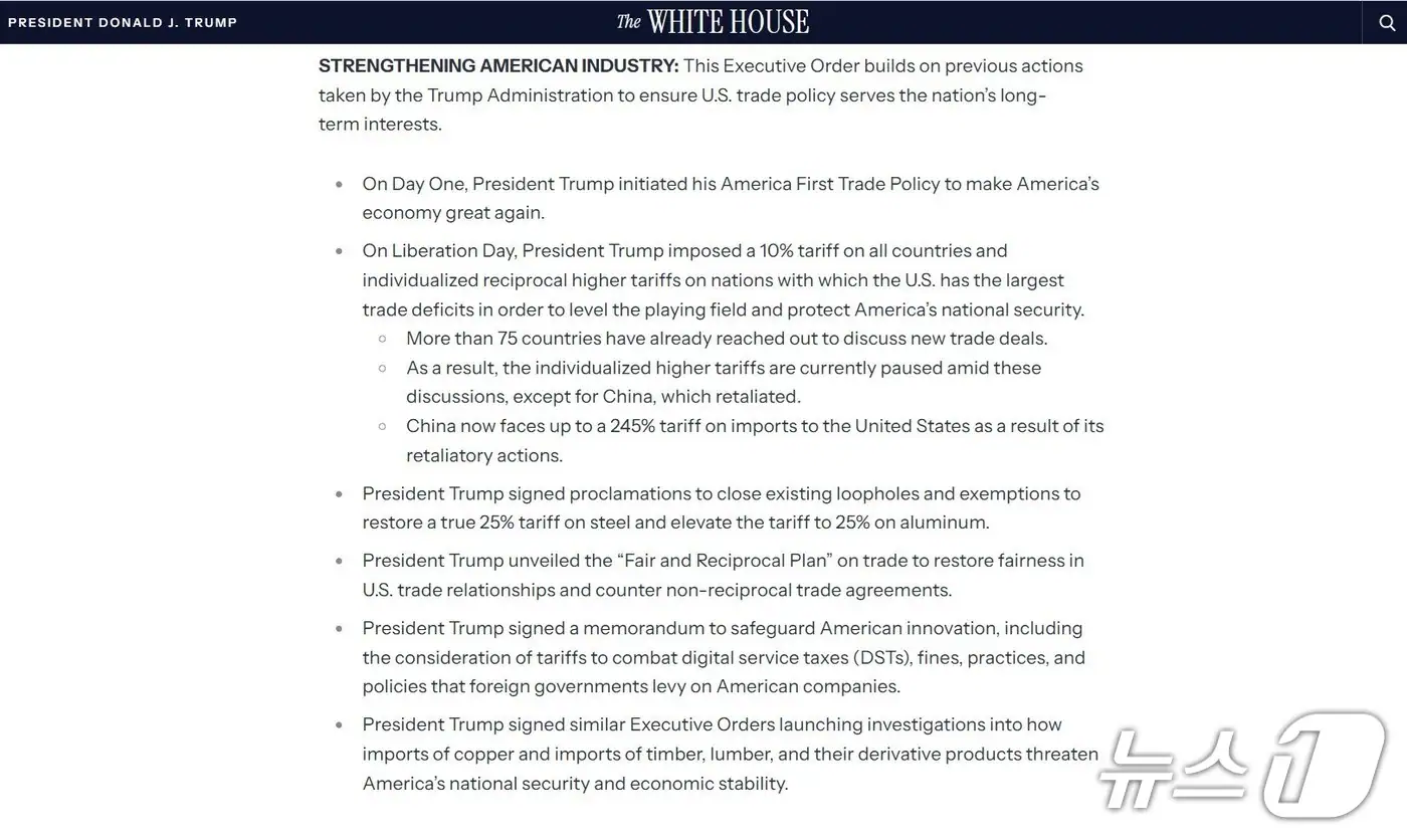 백악관이 15일(현지시간) 발표한 행정명령에서 미국은 중국에 최대 245%의 관세를 부과한다는 내용이 담겼다.