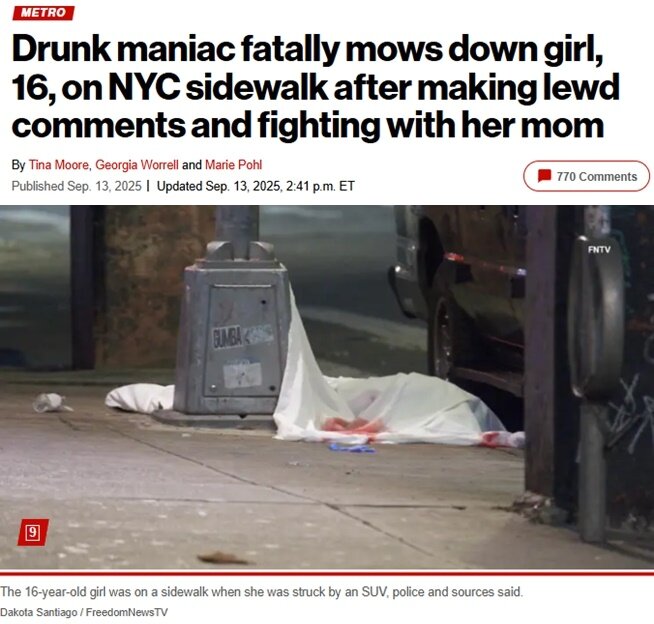 지난 13일(현지시간) 오전 2시 30분쯤 뉴욕의 한 교차로에서 16세 소녀가 SUV 차량에 치여 사망했다고 미국 뉴욕포스트 등이 보도했다.