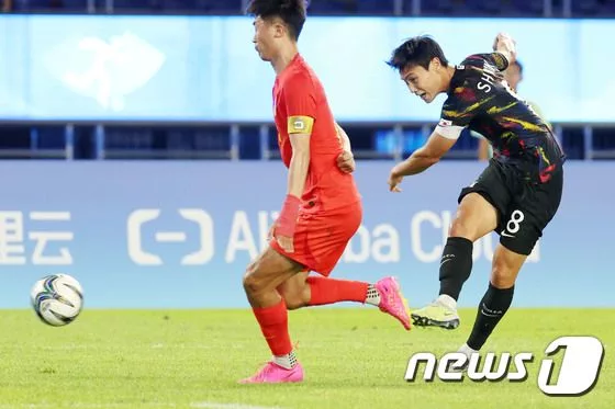 19일 오후 중국 저장성 진화시 스포츠 센터 스타디움에서 열린 2022 항저우 아시안게임 남자 축구 E조 조별리그 1차전 대한민국과 쿠웨이트의 경기에서 조영욱이 슛을 성공시킨 뒤 기뻐하고 있다. 2023.9.19/뉴스1 © News1 민경석 기자