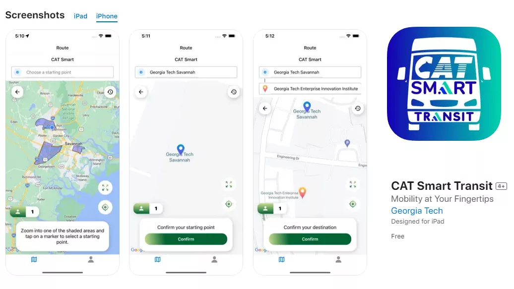 이 앱은 조지아 서던 대학교Georgia Southern University)에서 개발한 최첨단 기술을 사용하여 사람들이 전화나 노트북에서 바로 차량 서비스를 요청하고 운전자를 추적할 수 있게 해준다.