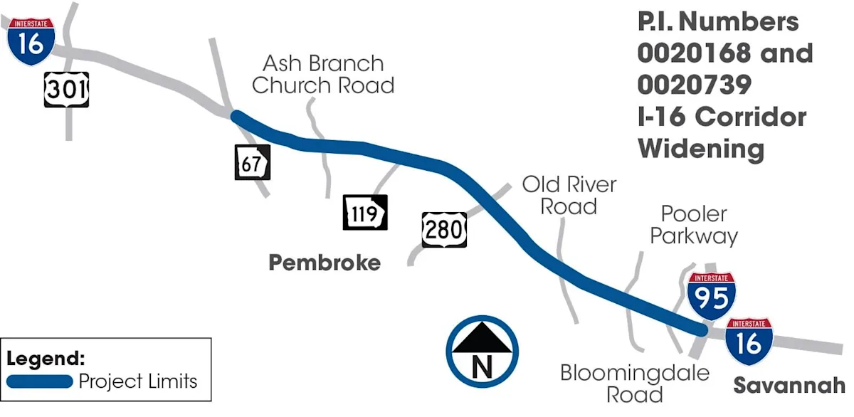 사바나 모닝뉴스 보도에 따르면, 조지아주 교통국(GDOT)은 I-16 고속도로의 32.5마일(약 52km) 구간을 기존 2차선에서 3차선으로 확장하는 대규모 도로 확장 사업을 가속화해 추진하고 있다. 총사업비는 약 5억 2,200만 달러로, 대부분 주(州) 예산으로 충당되며, 착공은 2027년으로 계획됐다.