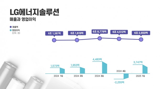 LG에너지솔루션은 1분기 매출 6조2650억원, 영업이익 3747억원을 실현했다고 30일 밝혔다. 전년 동기 대비 매출은 2.2%, 영업이익은 138.2% 늘었다. 직전 분기와 비교하면 매출은 2.9% 줄었지만, 영업이익은 적자에서 흑자로 전환했다. 지난해 4분기엔 2255억원의 적자가 났다.