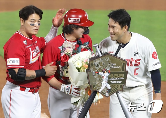 | 24일 오후 부산 사직야구장에서 열린 ‘2024 신한 SOL 뱅크 KBO리그’ 롯데 자이언츠와 SSG 랜더스의 경기, 2회말 SSG 추신수가 한미 2000안타 기록을 달성한 후 이숭용 감독에게 꽃다발을 받고 있다. 2024.4.24/뉴스1 © News1 윤일지 기자 |
