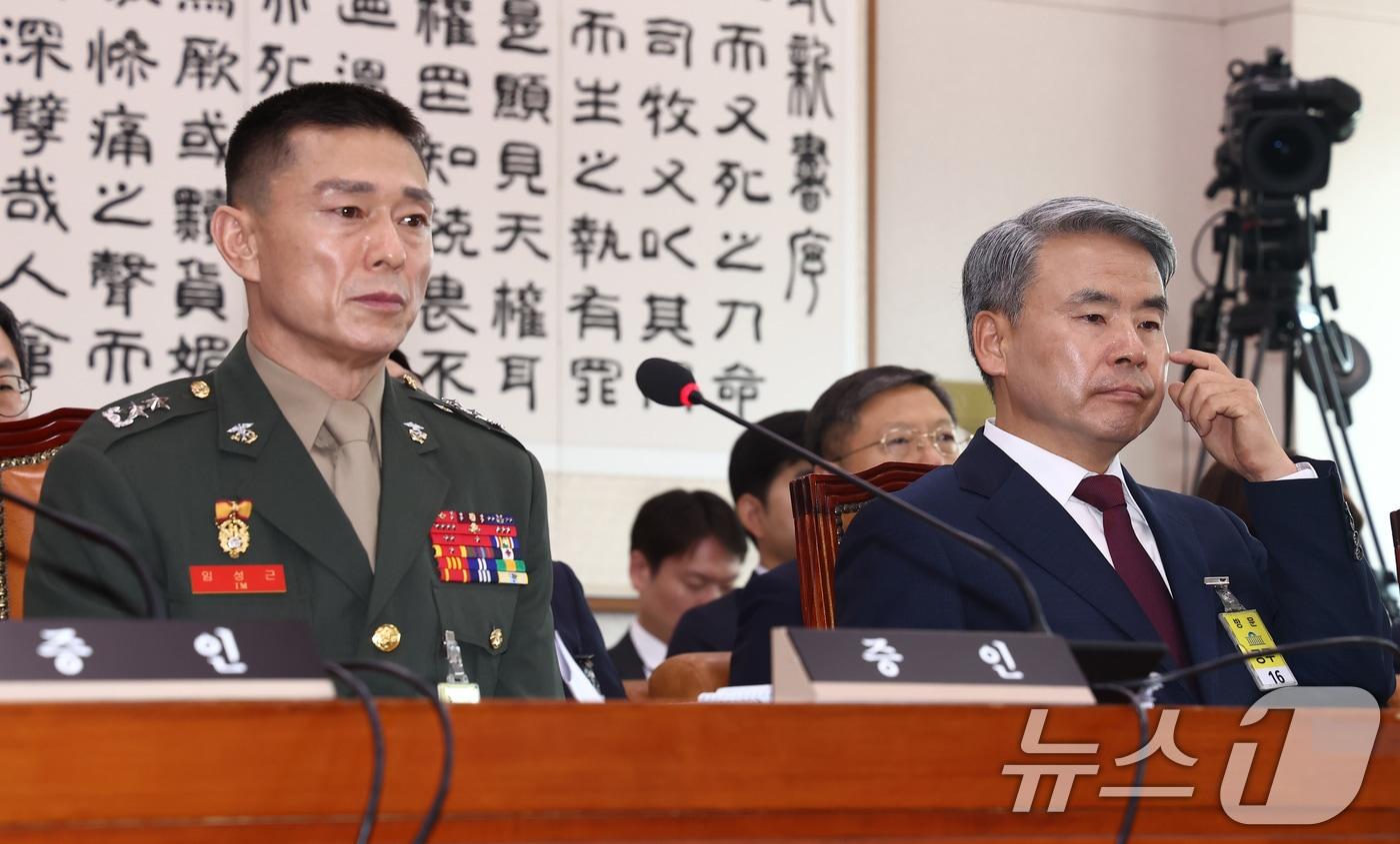 이종섭 전 국방부 장관이 21일 오전 서울 여의도 국회에서 열린 법제사법위원회 전체회의 순직 해병 수사 방해 및 사건 은폐 등의 진상규명을 위한 특별검사의 임명 등에 관한 법률안 관련 입법청문회에서 의원 질의를 듣고 있다. 왼쪽은 임성근 전 해병대 1사단장. 2024.6.21/뉴스1 ⓒ News1 김민지 기자